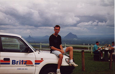 Blick vom Mary Cairncross Park auf die Glasy Mountains* Ich und unser Mietwagen vor den Glasy Mountains* Weiterfahrt zum Glass House National Park. |
