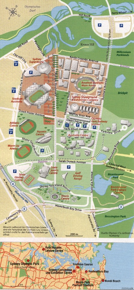 Karte vom Olympiagelände (Dateigröße: 184 kB, Quelle: geo Special Australien) Nach der Führung laufen wir noch ein wenig übers Olympiagelände. Leider muss man in jedem Gebäude extra bezahlen, so verzichten wir auf weitere Touren z.B. durch den Superdome und das Aqua-Center. |