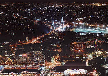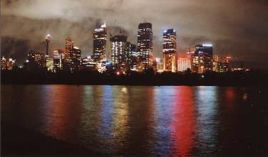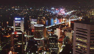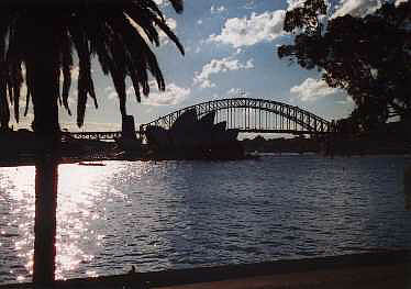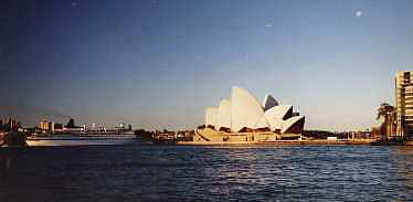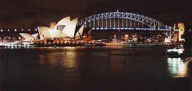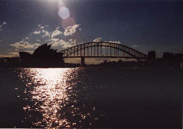 Wir fahren weiter zu den Rocks. Es bleibt uns nichts anderes übrig als den Wagen für $15 Tagesgebühr zu parken (schließlich wollen wir nicht jede Stunde $3 in eine Parkuhr nachwerfen). Es wird bereits langsam dunkel. An der Harbour-Bridge erkundigen wir uns nach den Preisen für das Besteigen der Brücke (siehe auch "Mutige Kletterer an Seil und Haken"). $90 erscheinen uns jedoch zu viel zu sein und wir entscheiden uns für eine Sunset-Tour im Hafen ($13 Studententarif, sonst $18) und bereuen es nicht. In der Dämmerung bietet sich uns das typische Postkartenmotiv über City, Oper und Harbour-Bridge. Abends gehen wir zum Darling Harbour und essen vorzüglich im blackbird Restaurant ($ 34 für zwei Personen; e-Mail: blackbird@netspace.net.au). Dann fahren wir hoch auf den AMP Tower im Centrepoint. Leider ist alles verglast und das Licht spiegelt sich. Trotzdem ist der Ausblick fantastisch. Nach dem Besuch des Sydney Towers fahren wir nochmal zum MrsMacquaries Point, um von dort noch mal die Aussicht auf die diesmal beleuchtete Oper und Harbour Bridge zu genießen. Im Dunklen ist es fast noch schöner als bei Tageslicht.