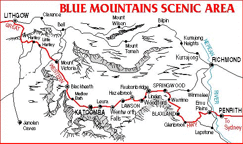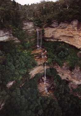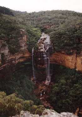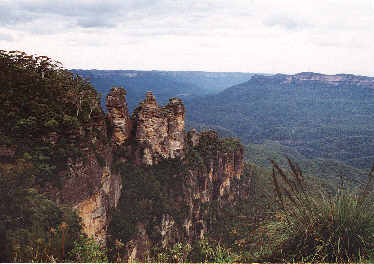 Heute fahren wir fahren zu den 65 km von Sydney entfernten Blue Mountains (siehe auch Reiseverlauf). Leider ist das Wetter ziemlich schlecht: teilweise Regen und nur ca. 22 Grad. Als erstes erreichen wir die Wentworth Falls. Eine Wanderung von oben zum Fuß des Wasserfalls ersparen wir uns aus Zeit- u. Wettergründen. Von hier aus fahren wir entlang des 20 km langen Cliff Drives nach Katoomba, dem auf Hügeln erbauten Hauptort der Blue Mountains. Beim Aussichtspunkt Echo Point südlich des Ortes stehen wir dann am Rande der Felsenklippen und blicken auf die drei Felsnadeln "Three Sisters" und das Jamison Valley. Bei dem heutigem schlechtem Wetter leider nicht so schön wie auf den Fotos im Reiseführer. (Link-Tipp: alle Nationalparks von New South Wales, Blue Mountains Web) |