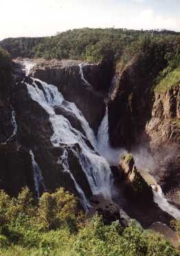 An der Station angekommen, nehme ich an einer rd. 20minütigen Rangerführung durch einen durch Wege vorbereiteten Stück Regenwald teil. Es ist sehr interessant, was der Ranger uns zeigt und erklärt. Unterwegs ist eine ca. 30 cm große (angeblich handelte es sich nur um eine kleinere) Spinne sehr aufregend für alle Touristen. Alles was hier gezeigt wird ist wirklich echt, nichts ist verändert oder angelegt worden, so versichert der Ranger. So können wir auch noch die Auswirkungen des vergangenen Wirbelsturms erkennen. Die entwurzelten Bäume und die damit entstehenden Lichtlöcher lassen den Regenwald an diesen Stellen wieder ein Stück weit neu entstehen, lehrt uns später auch das Visitorcenter. Weiter geht's mit der Seilbahn zur Deans Peak Barron Falls Station, welche mit einem Informationszentrum über den Queensländer Regenwald (Rainforst Interpretive Centre) sowie einem Weg zum Aussichtspunkt über die Barron Falls aufwarten kann. Der Wasserfall ist wirklich toll; der Barron River hingegen führt offensichtlich sehr viel Erde mit sich und ist entsprechend nur als "braune Brühe" zu bezeichnen.