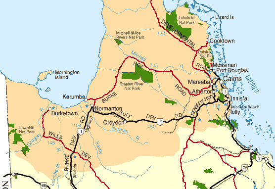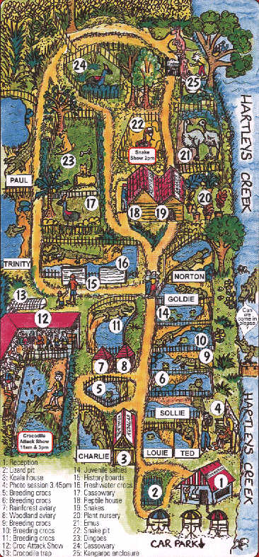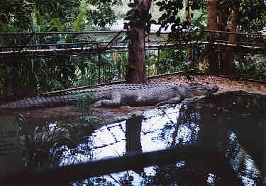 Zurück auf dem landschaftlich sehr reizvollen Cook-Highway Richtung Port Douglas fahre ich nun direkt an der Küste entlang, diesmal mit wunderschönem Sandstränden und Palmen einerseits und regenwaldbedeckten Bergen andererseits. Nachmittags komme ich zur Hartleys Krokodil Farm am Cook Highway in Wangetti (Eintritt $ 14,40; Übersichtskarte). Hier werden allerlei "Krokos" gezeigt, auch mit Showeffekt, wenn der Wärter versucht einem Krokodil das Essen weg zu ziehen. Außerdem gibt es hier Koalas und Kängurus zu sehen.