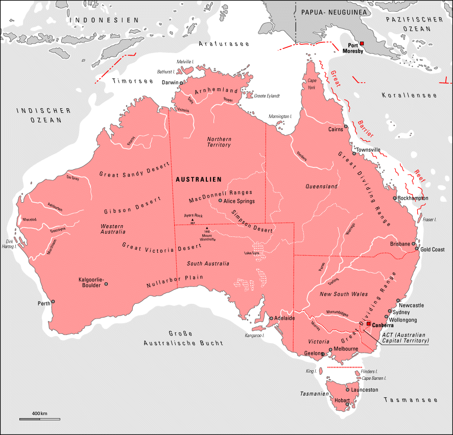 | Städte: | Sydney 3.986.700 Einw., Melbourne 3.371.300, Brisbane 1.574.600, Perth 1.341.900, Adelaide 1.088.400, Newcastle 473.900, Gold Coast-Tweed 379.200, Canberra [Hauptstadt] 308.100, Wollongong 260.100, Hobart 195.000, Sunshine Coast 167.800, Geelong 154.100 |